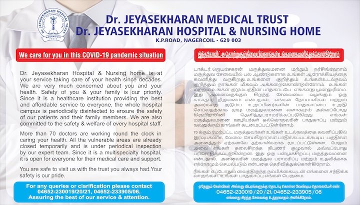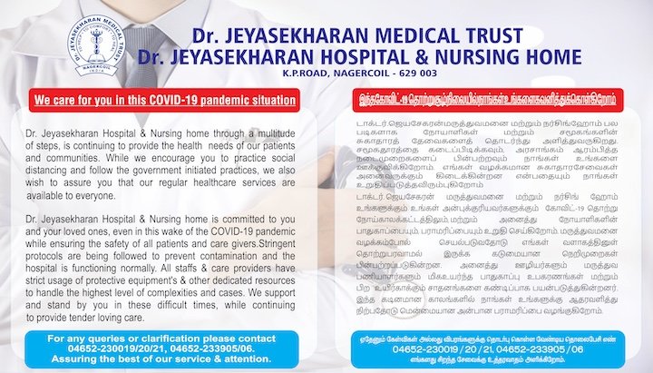 Dr. Jeyasekharan Hospital & Nursing home is committed to you and your loved ones, even in this wake of the COVID-19 pandemic while ensuring the safety of all patients and care givers. Stringent protocols are being followed to prevent contamination and the hospital is functioning normally. All staffs & care providers have strict usage of protective equipment’s & other dedicated resources to handle the highest level of complexities and cases. We support and stand by you in these difficult times, while continuing to provide tender loving care. For any queries or clarification please contact 04652-230019/20/21, 04652-233905/06.  Assuring the best of our service & attention.