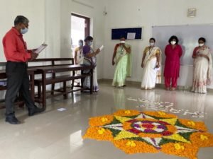 The programme started with Prayer song and Tamilthai vazhthu by First year Allied Health students. Mr. Mohammed Asif, First year BSc. Cardiac Technology student welcomed all the dignitaries. The programme was inaugurated by Mrs.Beena Sabu (Correspondent), Mrs.Sujatha Ranjit (Administrator) by lighting the kuthuvillakku. The celebration was graced by our guests Dr. Alex Francisco Nicholas (Consultant Anesthesiologist), Mrs. Vanammal (Nursing Superintendent), Mr. Sam Robin Rolands (Quality Manager) and Dr.Sarayu Priya (Principal, College of Nursing). Mrs.Beena Sabu, Correspondent and Mrs. Jeyalakshmi, Course Coordinator delivered Onam message to the students.