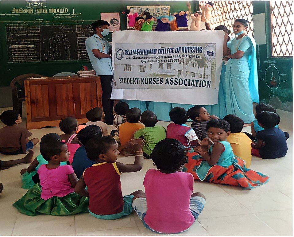 Master of ceremony was Gayathri, IV-year B.Sc. Nursing. The SNA meeting started at around10.30 am in Anganwadi at Agastheeswaram .Anganwadi children (27), IV year B.Sc. Nursing students(12), Anganwadi Teacher(1), helper(1) and staff of Dr. Jeyasekharan College of Nursing (Mrs.Priya& Mrs.Vimalmathi) participated in the event. The SNA activity was launched to celebrate Oral Health day.